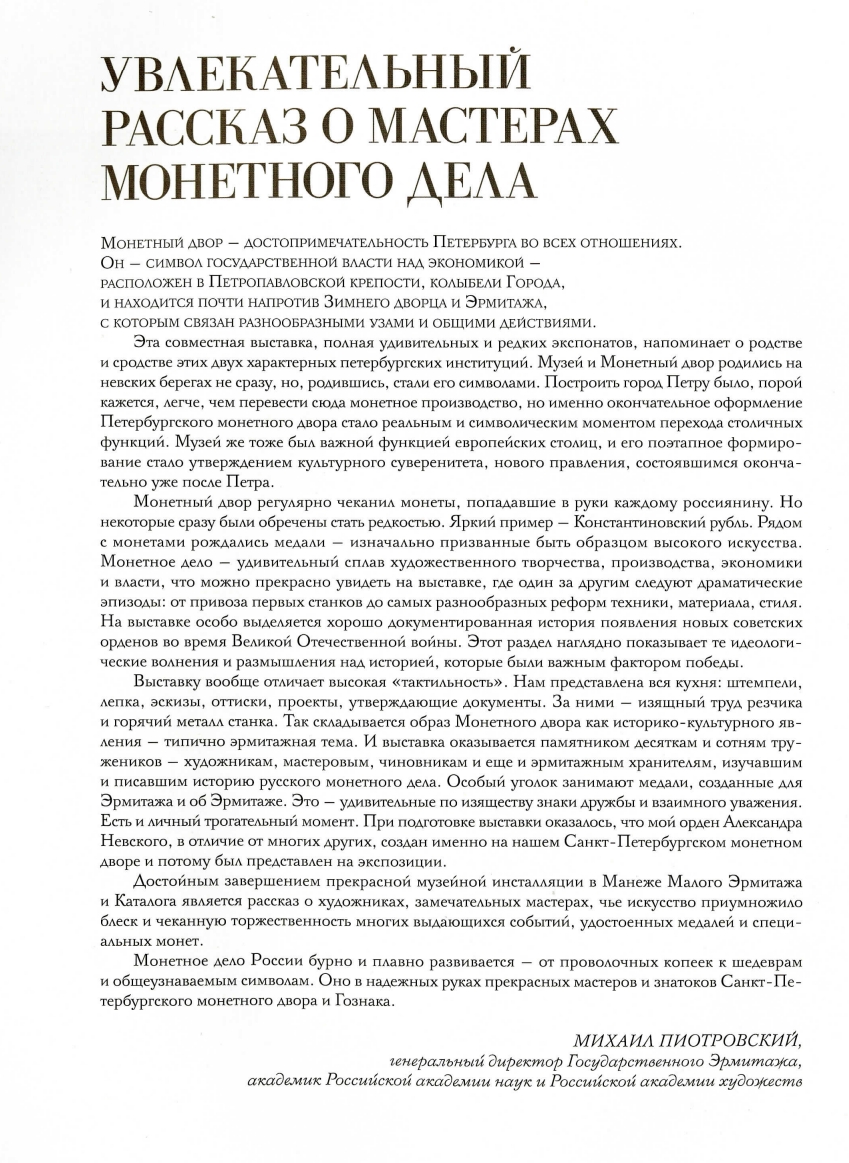 Каталог включает более полутора тысяч экспонатов из собраний Государственного Эрмитажа и АО «Гознак», многие из которых публикуются впервые. В издание также включены документы из Российской национальной библиотеки. Все эти материалы позволяют проследить трёхвековую историю одного из старейших петербургских предприятий: от времени Петра I до наших дней. Особое внимание уделено памятникам первых лет работы монетного двора в Санкт-Петербурге. Большой интерес представляют материалы советского и постсоветского периодов. Среди них: эскизы, пробные оттиски, утверждённые и не получившие утверждения образцы, штемпельный инструмент. Заключительная часть каталога посвящена современным работам художников дизайнерского центра АО «Гознак».